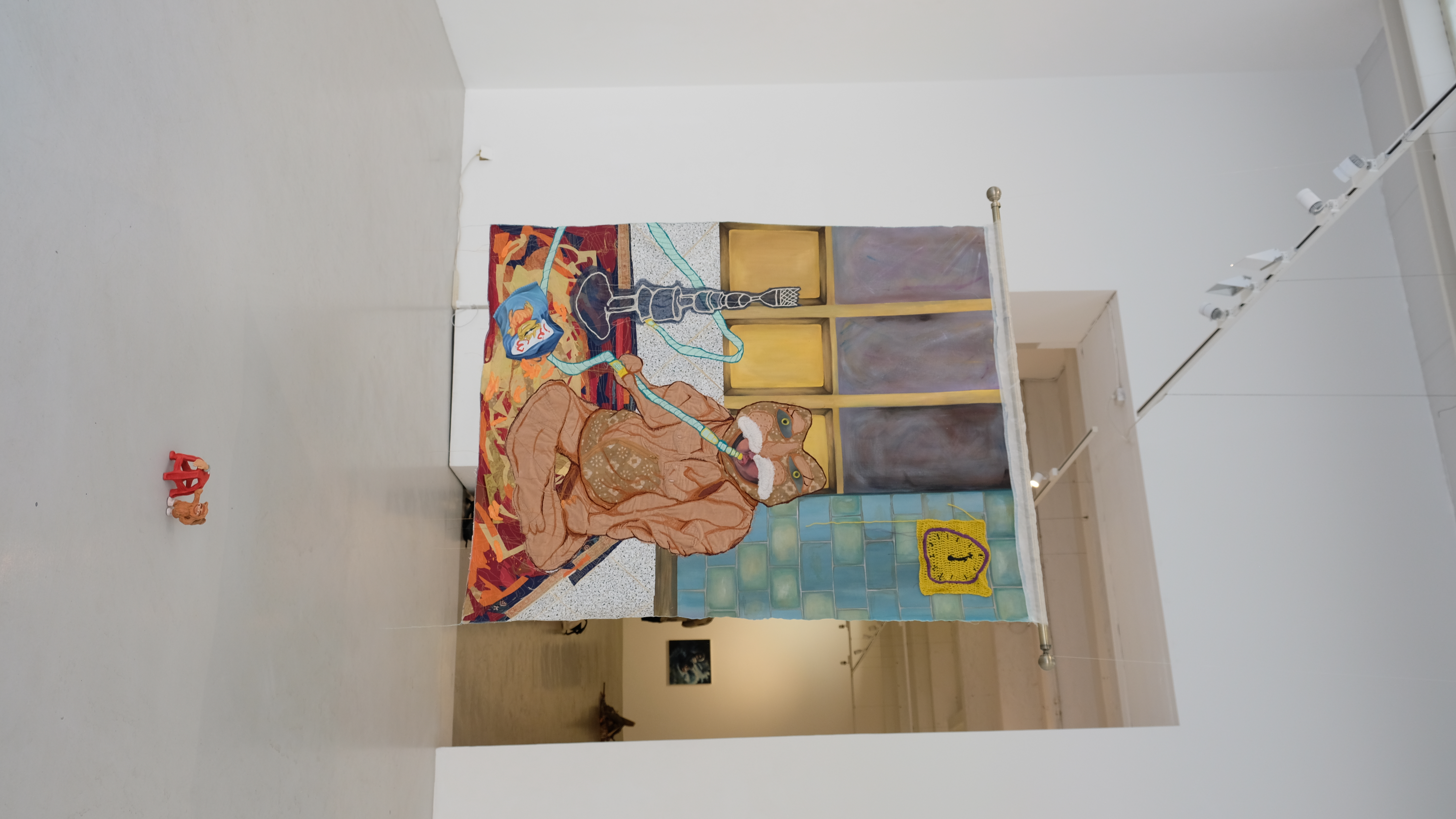 Acrylic, fabric, wool, vinyl sticker; with embroidery on canvas